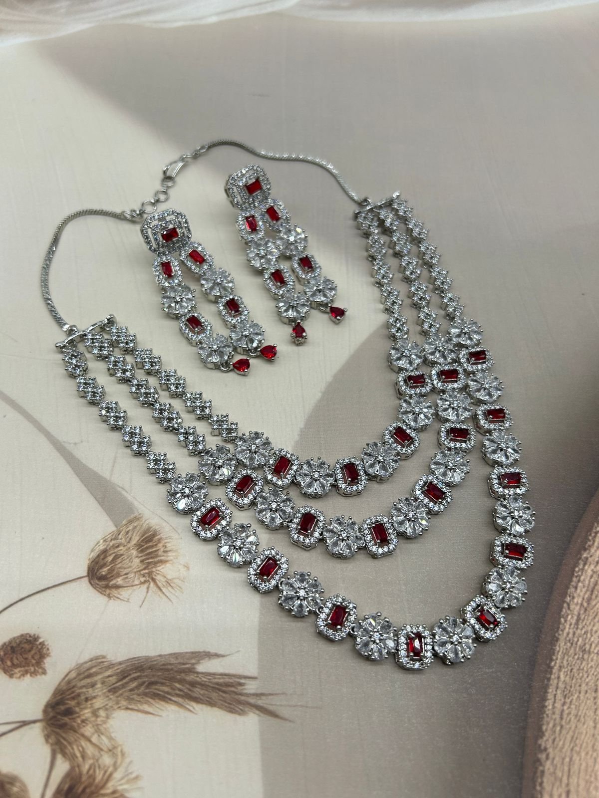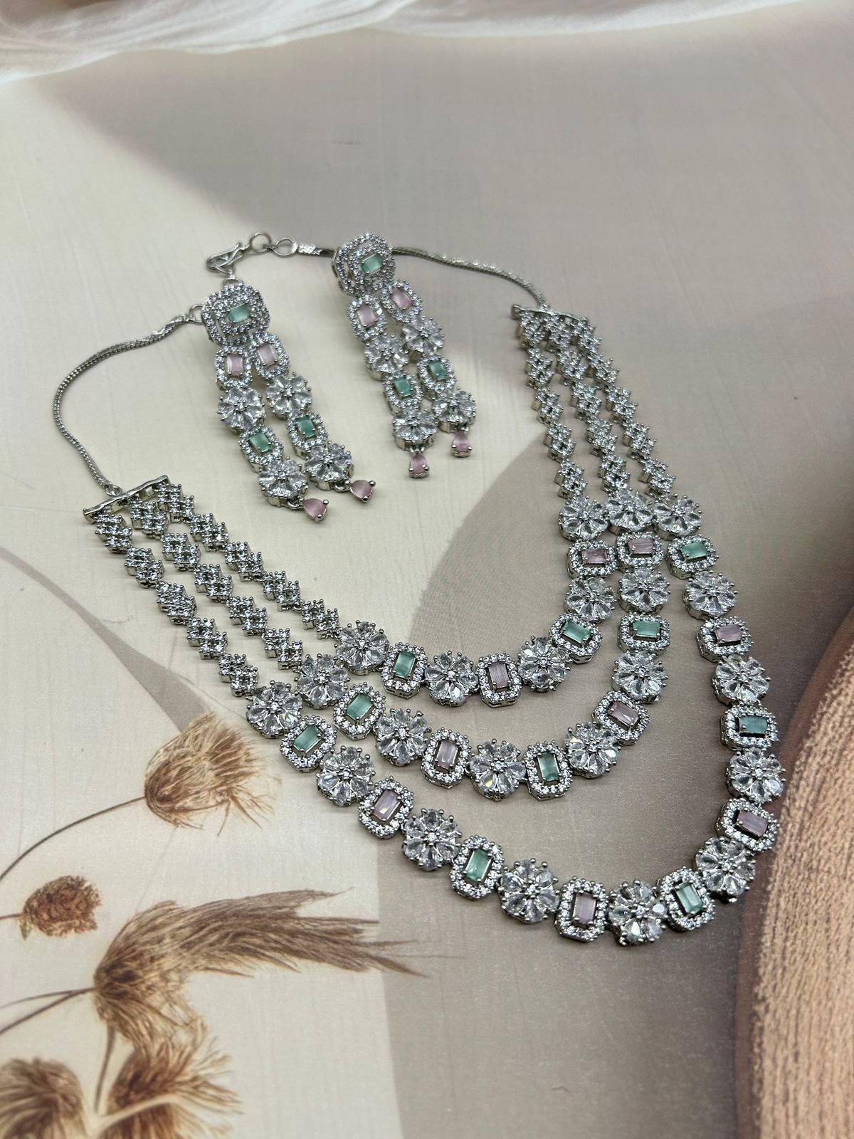 Crafted with attention to detail, the AD Necklace With Earrings showcases intricate artistry that sets it apart from ordinary jewelry. The necklace features finely arranged American Diamonds that shine brilliantly, paired with earrings that add a harmonious touch to the entire ensemble.
